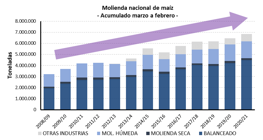 En cuanto a los destinos del maíz industrializado, el 65% fue para alimento balanceado, el 22% para molienda húmeda, el 3% para molienda seca y el 10% fue a parar a otras industrias.