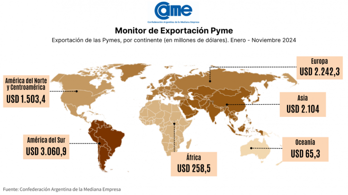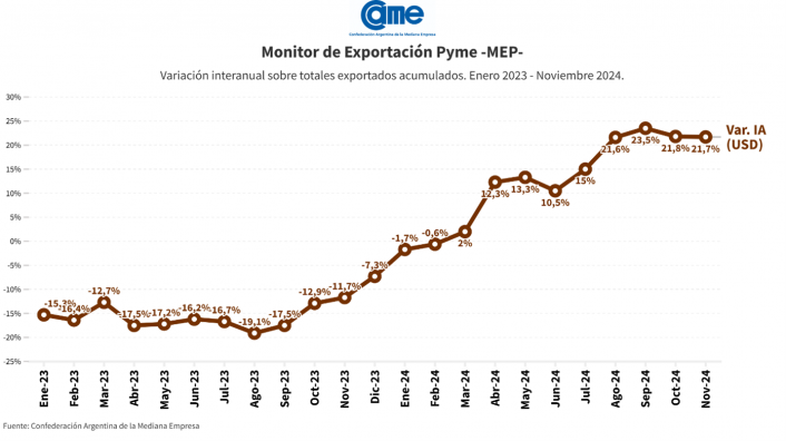 Las exportaciones de las empresas pymes crecieron 21,7%, alcanzando los USD 9.234 millones exportados, lo que representa el 12,4% del total exportado por la Argentina en el período enero–noviembre 2024.